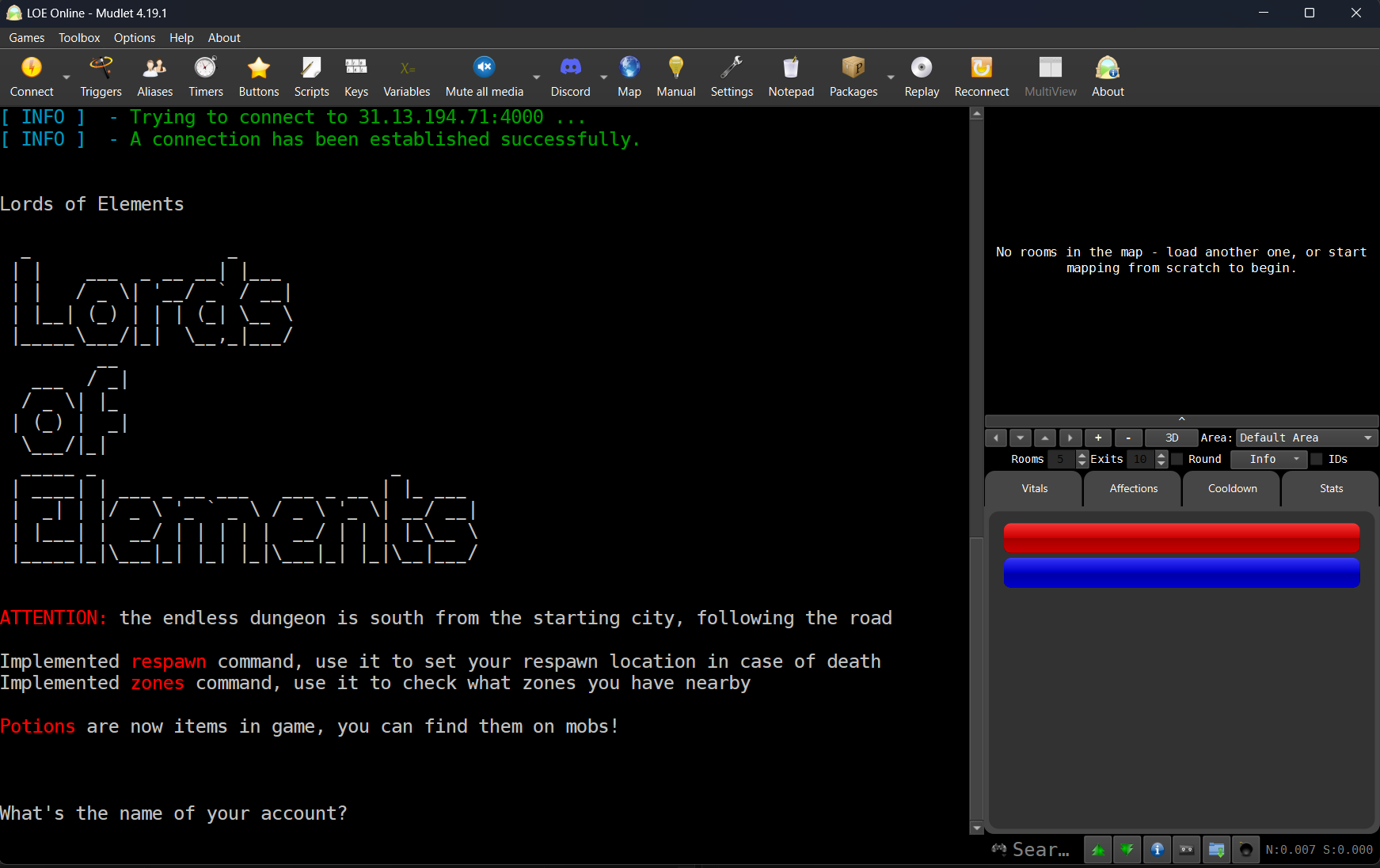 On the first connection, Mudlet will download a package of settings dedicated to the game